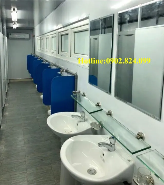 - Khu vực sinh hoạt: Phần diện tích còn lại được ngăn cách biệt lập, bố trí phòng vệ sinh và phòng tắm đầy đủ tiện nghi (vòi sen, bồn cầu, lavabo). Điều này giúp nhân sự có thể vệ sinh cá nhân, tắm rửa ngay sau giờ làm việc mà không cần di chuyển xa.