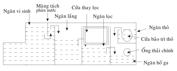 Hầm phân gồm 4 ngăn: ngăn thứ nhất là bể phân vi sinh. Khi nước và phân đi vào bể này thì vi sinh làm tách nước và phân ra đồng thời khử mùi. Nước thì qua lưới cản, cặn đi vào ngăn lắng thứ hai, còn phân thì ở lại tiếp tục để vi sinh phân hủy. Khi nước phân đi qua bể lắng thứ hai sẽ đi qua ngăn lắng thứ ba, đây cũng gọi là ngăn lọc. Ở đây có thể dùng sỏi đá, than hoạt tính hoặc là lưới “ nonwoven “ tùy theo khả năng phân hủy của vi sinh. Sau khi qua ngăn lọc, sẽ đi vào ngăn hố ga cuối cùng. Ở đây sẽ gặp nước thải sàn và lavabo rồi cùng nhau theo ống thải chính ra ngoài. Ống thải chính có van khóa mở để tiện cho việc nối ống và di chuyển.
