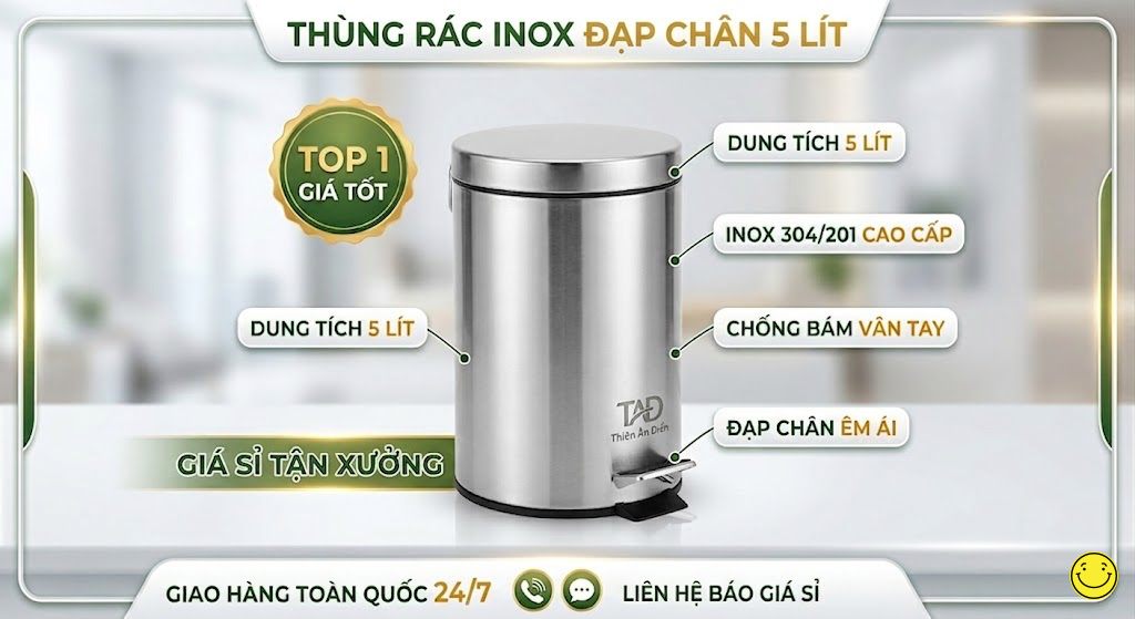 Với định vị là Tổng kho phân phối số 1, Thiên Ân Điển cam kết mang đến chính sách 🏆 TOP 1 GIÁ TỐT và 🔥 GIÁ SỈ TẬN XƯỞNG cho mẫu Thùng rác Inox đạp chân 5 Lít này: